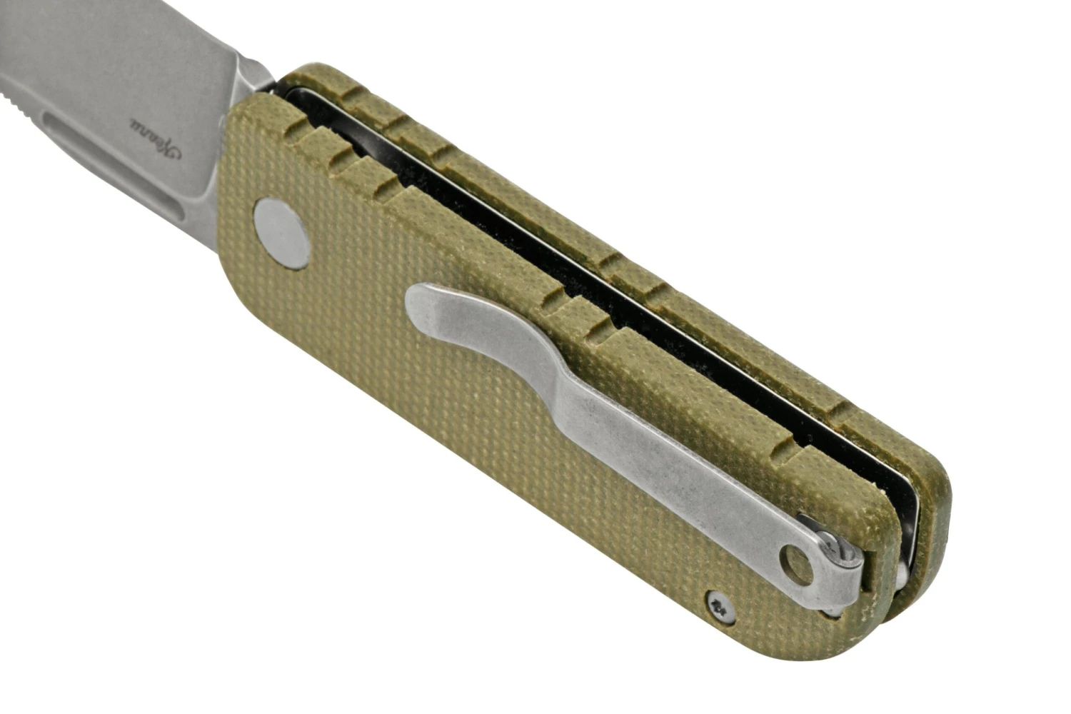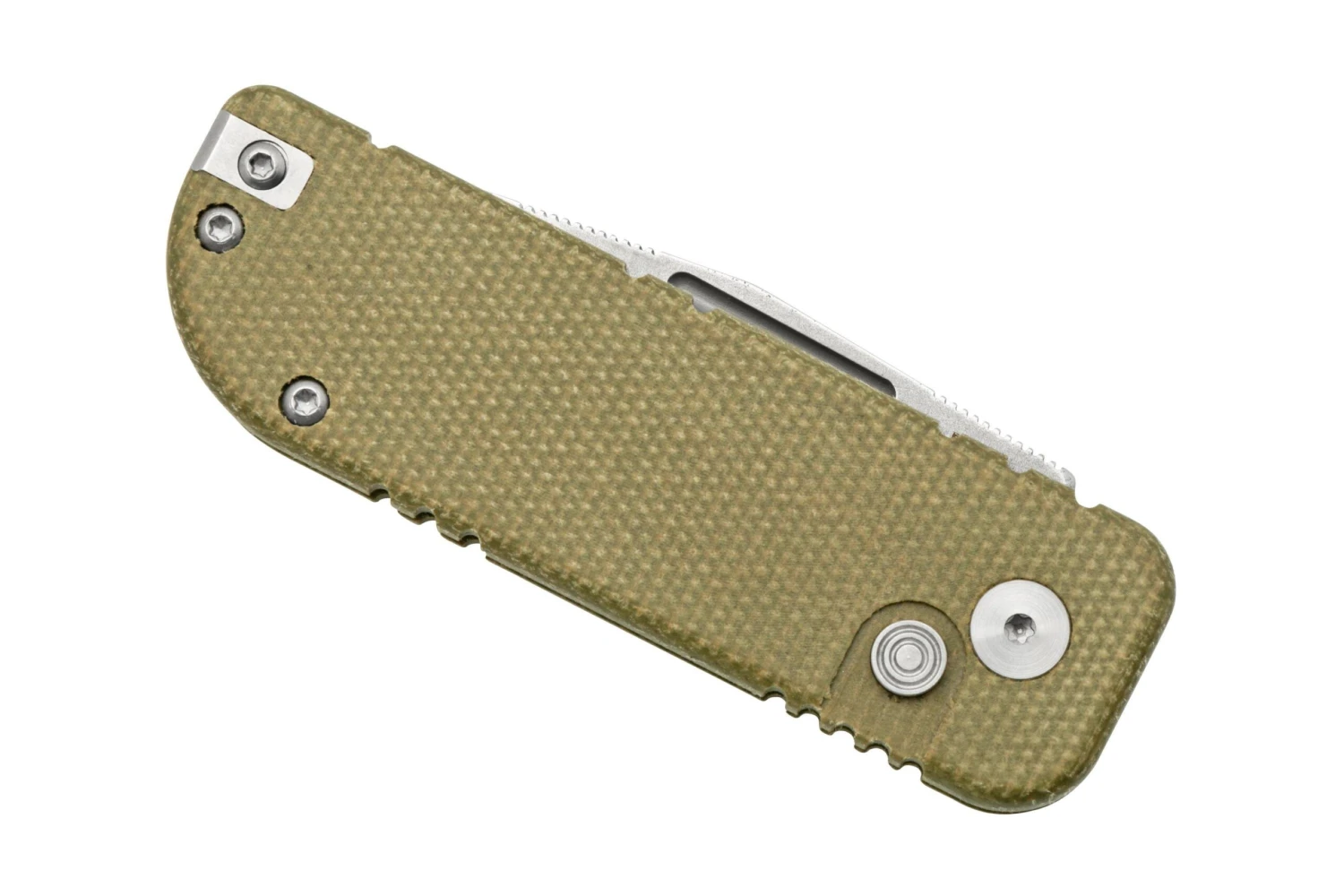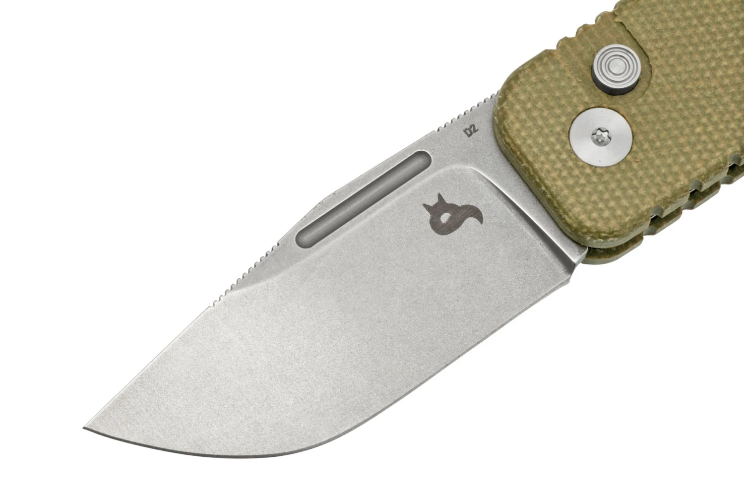 La Fox Knives NU-Bowie es una elegante navaja que ofrece una gran relación calidad-precio. La hoja se abre con las dos manos pulsando simultáneamente el botón de bloqueo y abriendo la hoja con la muesca para uñas. Una vez completamente abierta, el mismo botón de bloqueo bloquea la hoja. Para cerrar la hoja, mantén pulsado de nuevo el botón de bloqueo y empuja la hoja hacia atrás. ¡Esto va como la seda! La hoja está hecha de acero D2. Se trata de un acero para herramientas resistente que aguanta golpes, se mantiene afilado durante mucho tiempo y además es fácil de afilar. Necesita algo de mantenimiento de vez en cuando, ya que el D2 no es completamente inoxidable. Sin embargo, las ventajas de este acero lo convierten en un gran acero. El mango minimalista está fabricado en micarta: un resistente material compuesto de lino y resina sintética. Es resistente y ofrece mucho agarre, incluso en situaciones húmedas.