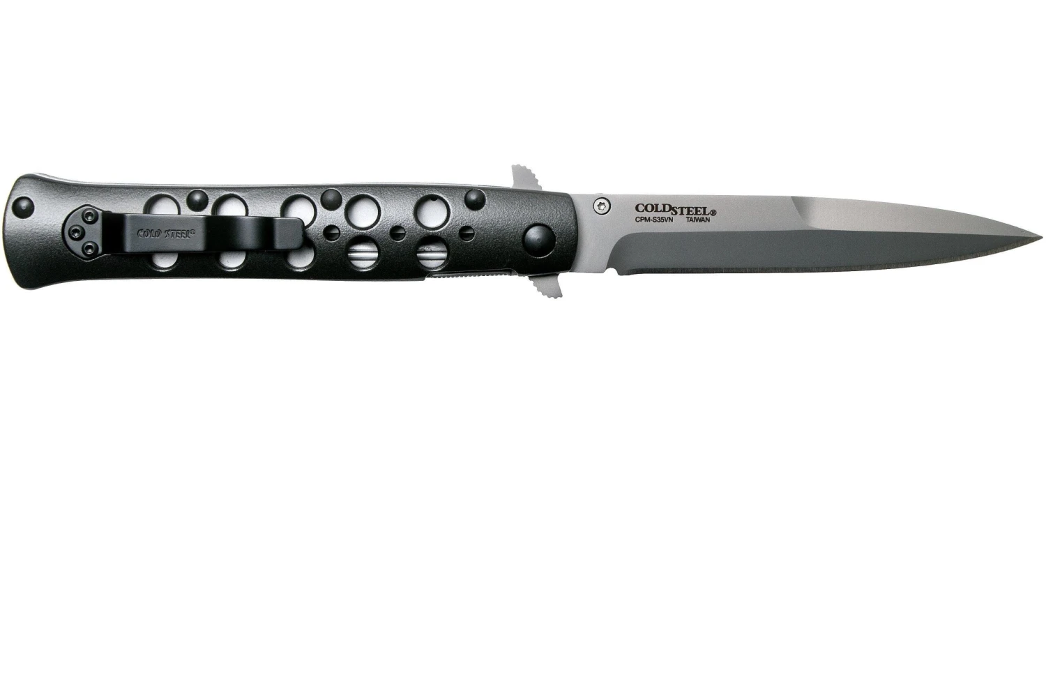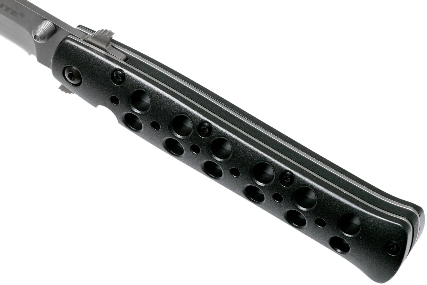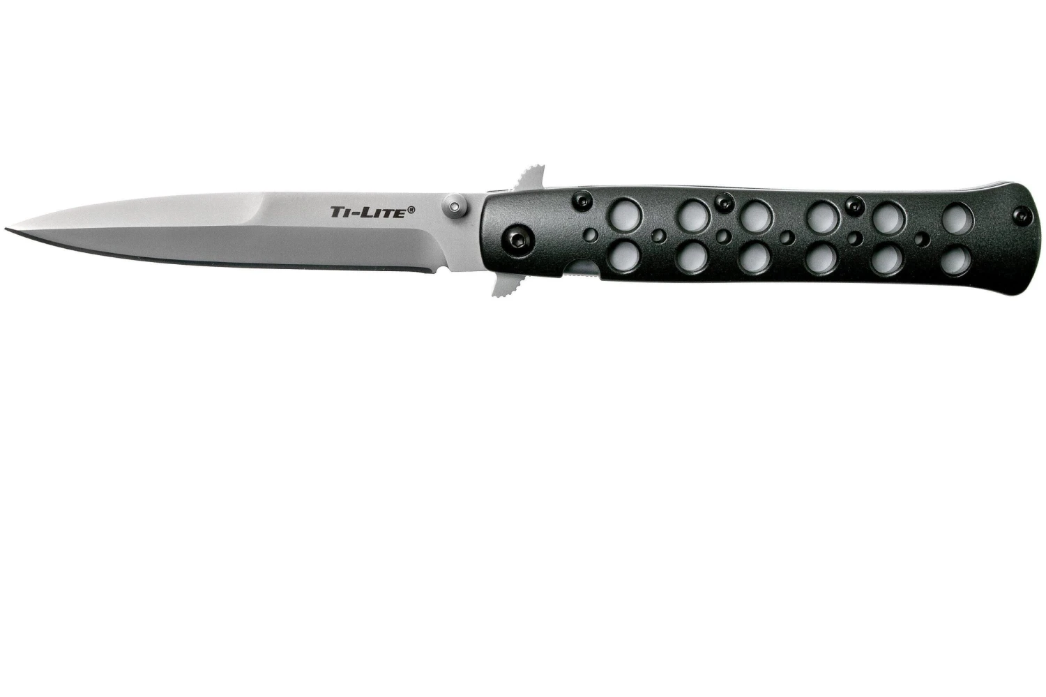 La Cold Steel Ti-Lite es una navaja fina que se puede abrir de varias maneras. Por ejemplo, se puede abrir con el flipper, el perno para el pulgar o el flipper frontal. La hoja está hecha de acero CPM S35VN. Un tipo de acero inoxidable americano. La hoja tiene una forma puntiaguda y fina de punta de lanza. El mango es de aluminio. Para ahorrar peso se han fresado recortes en el mango.
