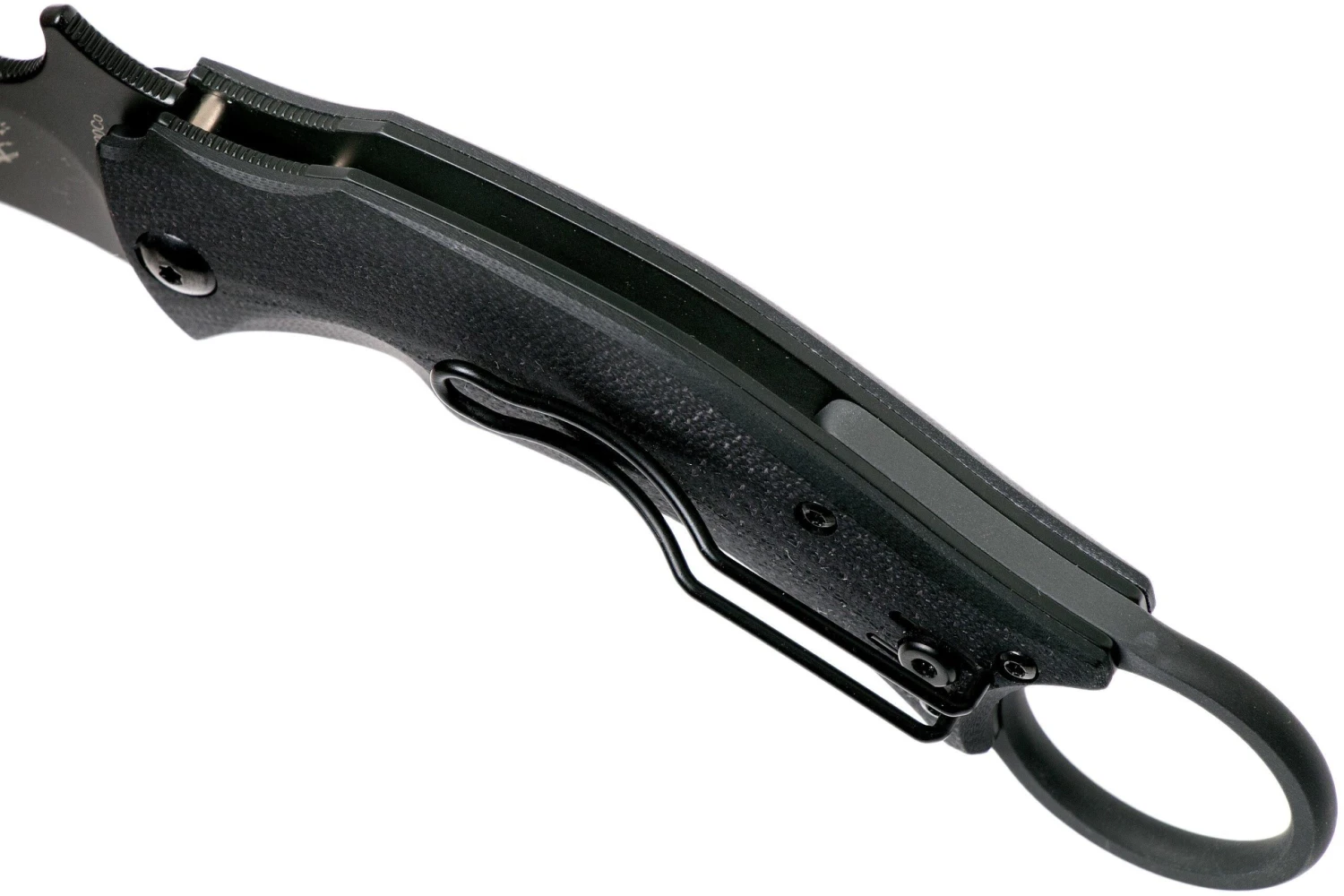 El Fox Black Bird Bastinelli FX-591 es un cuchillo karambit genial, diseñado por Bastinelli Designs. Diseñó la navaja de tal manera que puedes ponerte a trabajar inmediatamente cuando la sacas de tu bolsillo. El lomo está concretamente realzado con un abridor de ondas. Se enganchará detrás del borde de tu bolsillo, abriendo la hoja. No hay forma más rápida de abrir un cuchillo.
