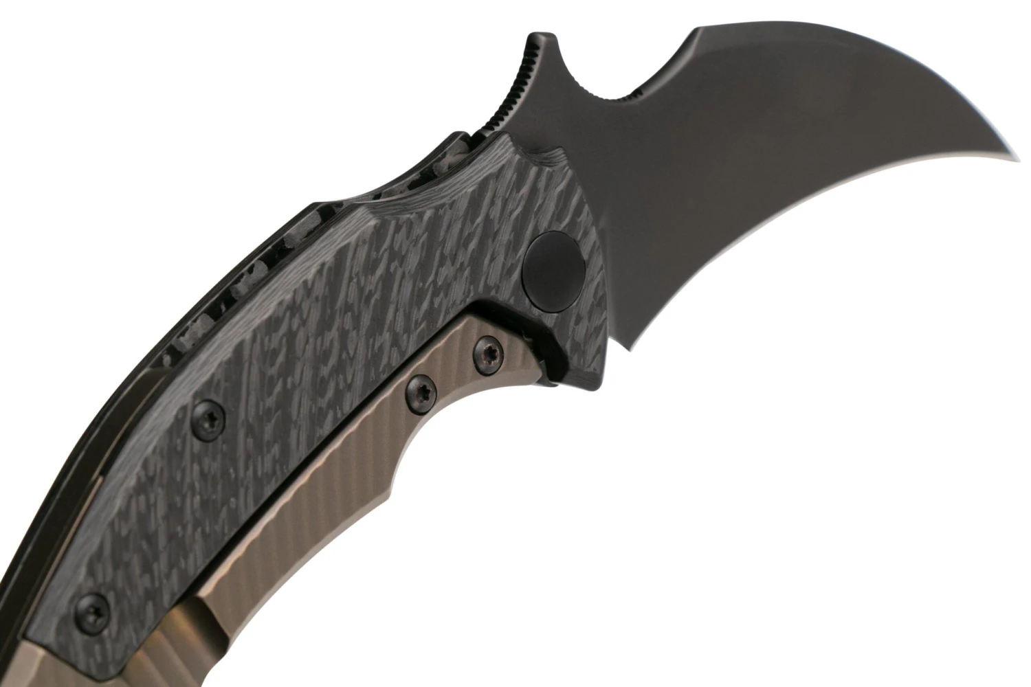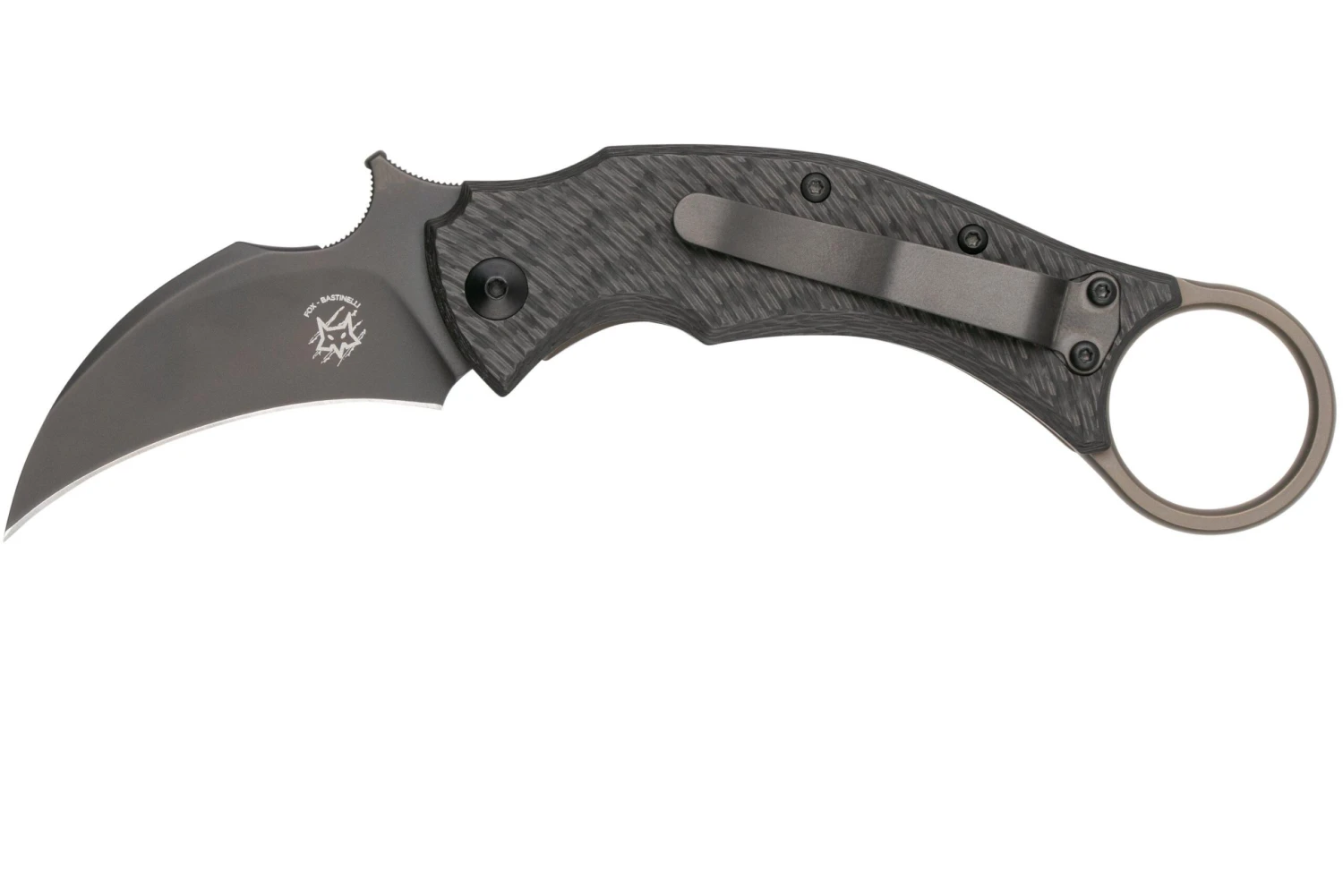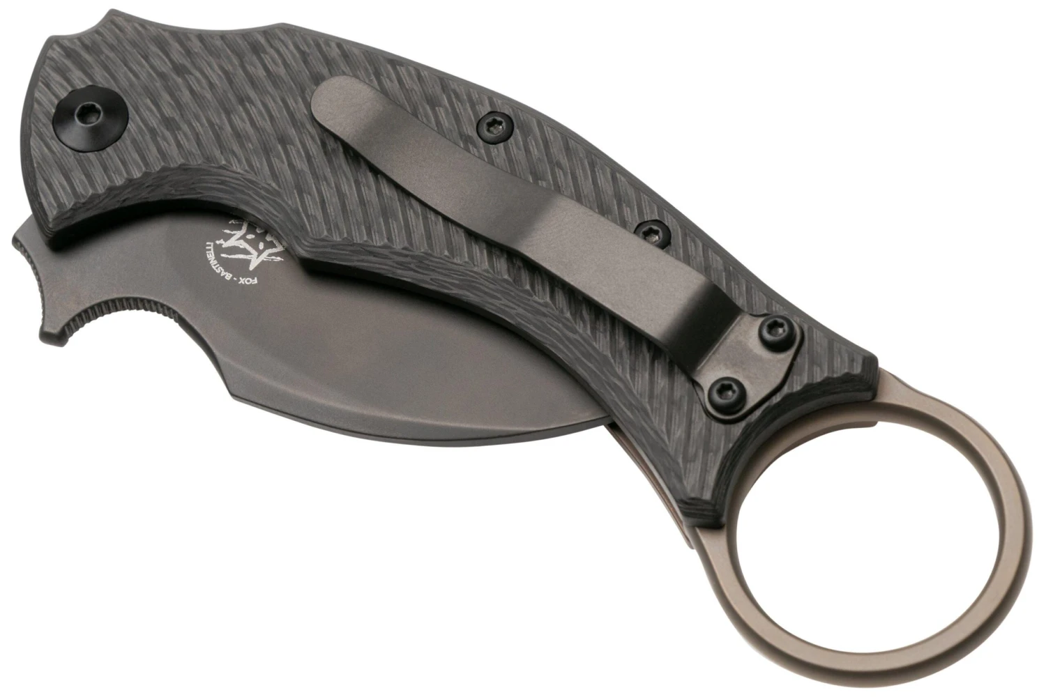 El Fox Black Bird Bastinelli FX-591TICBR es un cuchillo karambit genial, diseñado por Bastinelli Designs. Diseñó este cuchillo para utilizarlo directamente, nada más sacarlo del bolsillo. En el lomo encontrarás un abridor de olas. Se engancha en el borde del bolsillo, por lo que el cuchillo se abre inmediatamente. No hay forma más rápida de abrir un cuchillo.