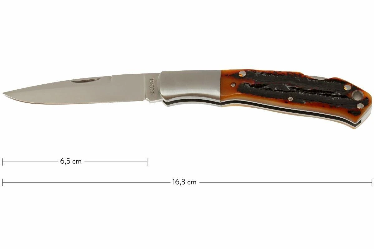 Cada uno de estos hermosos cuchillos de caballero es único debido al uso del cuerno de ciervo natural como material para las partes del mango. El MK533ANZ tiene el acabado de alta calidad que caracteriza a Moki. Los diferentes materiales encajan a la perfección y la hoja VG10 se bloquea sin problemas mediante un cierre trasero. La funda suministrada también se ajusta al carácter exclusivo de este cuchillo.