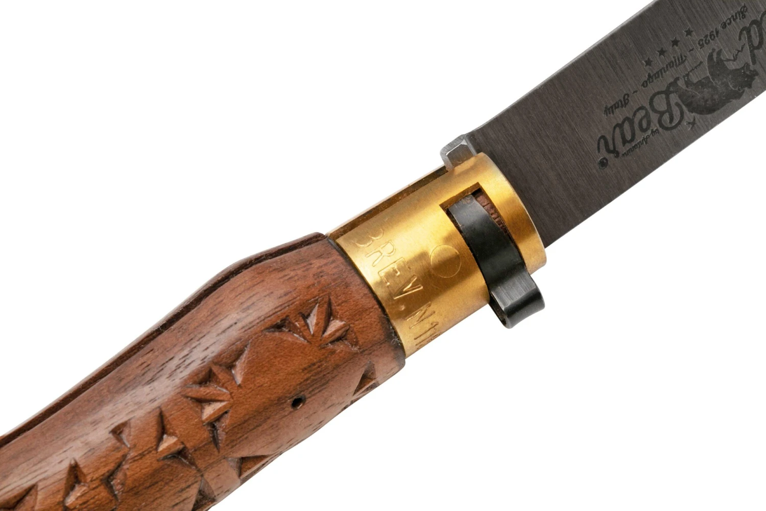 La Old Bear Classical Carved Walnut M es una navaja clásica de Italia. La hoja se abre fácilmente con la uña. Lo haces con las dos manos. Por ello, el cuchillo puede llevarse legalmente en casi toda Europa. El cuchillo se bloquea tanto cuando está abierto como cuando está cerrado. Es el resultado de un mecanismo Lupo-lock, un bloqueo de anillo que hemos visto en marcas de cuchillos similares pero que puede ser controlado con una sola mano.