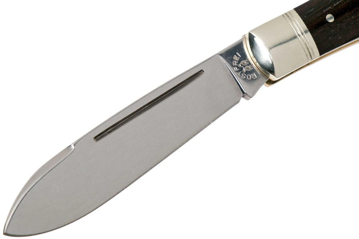 El Robert Klaas 95 mm es un impresionante cuchillo de caballero. La hoja tiene forma spearpoint (punta de lanza) de época. Algo muy típico de este tipo de cuchillos es el filo unilateral en el lomo de la punta. No está afilada, pero es maravillosa como elemento de diseño adicional. Además, esta parte fina hace que la punta sea también más fina y perfecta para los trabajos de detalle.